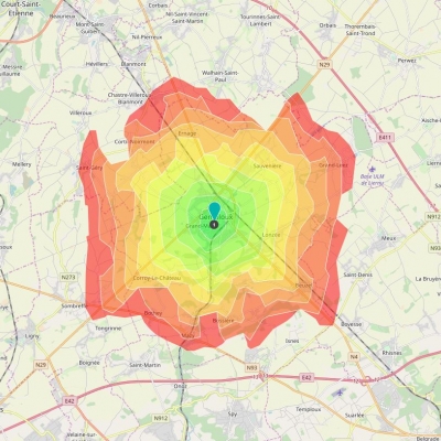 - Les courbes isochrones (30 min de vélo) depuis chaque village / quartier de Gembloux ;
